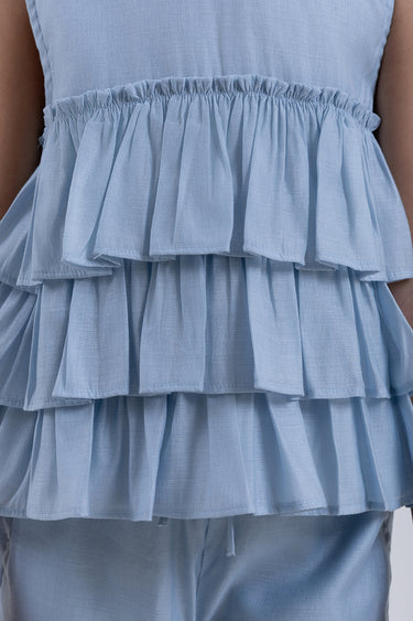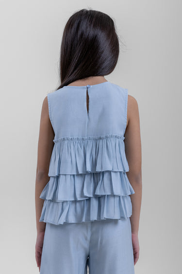 Girls sleeveless top designed with a round neckline and a relaxed fit. Features layered ruffle detailing that adds soft volume and movement. Comfortable and easy to style, suitable for everyday wear and casual occasions.