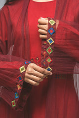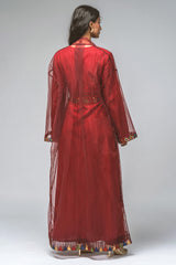 Lightweight outer abaya crafted from a soft sheer fabric with an open-front design. Features wide flowing sleeves accented with intricate embroidered trims that add a refined artisanal touch. The relaxed silhouette drapes elegantly over any outfit, offering graceful movement and a sophisticated layered look suitable for evening gatherings and cultural occasions.