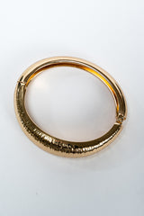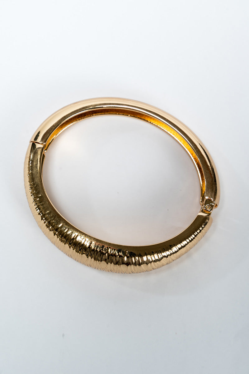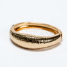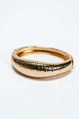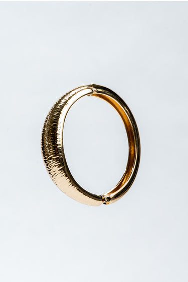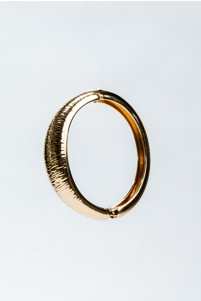 A bold circular bangle with a rich metallic shine and subtle textured details that catch the light elegantly. Designed with an integrated closure for easy and secure wear, making it a versatile piece suitable for both casual looks and dressed-up moments.