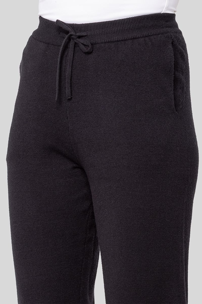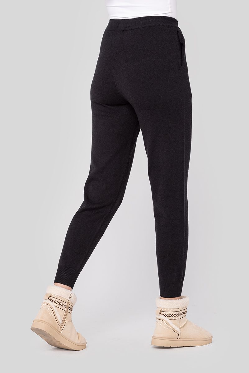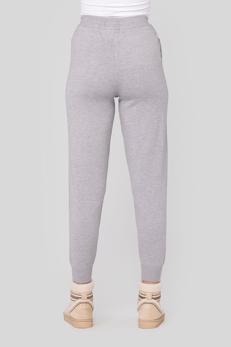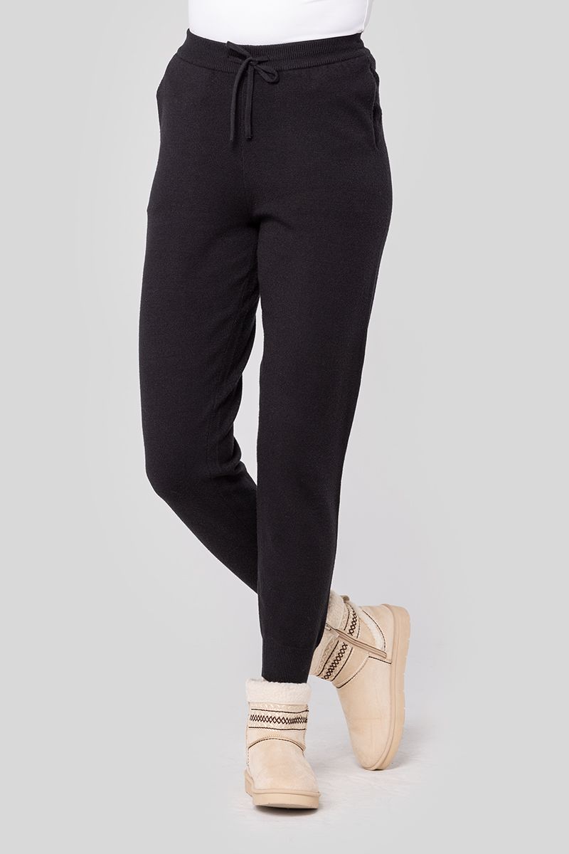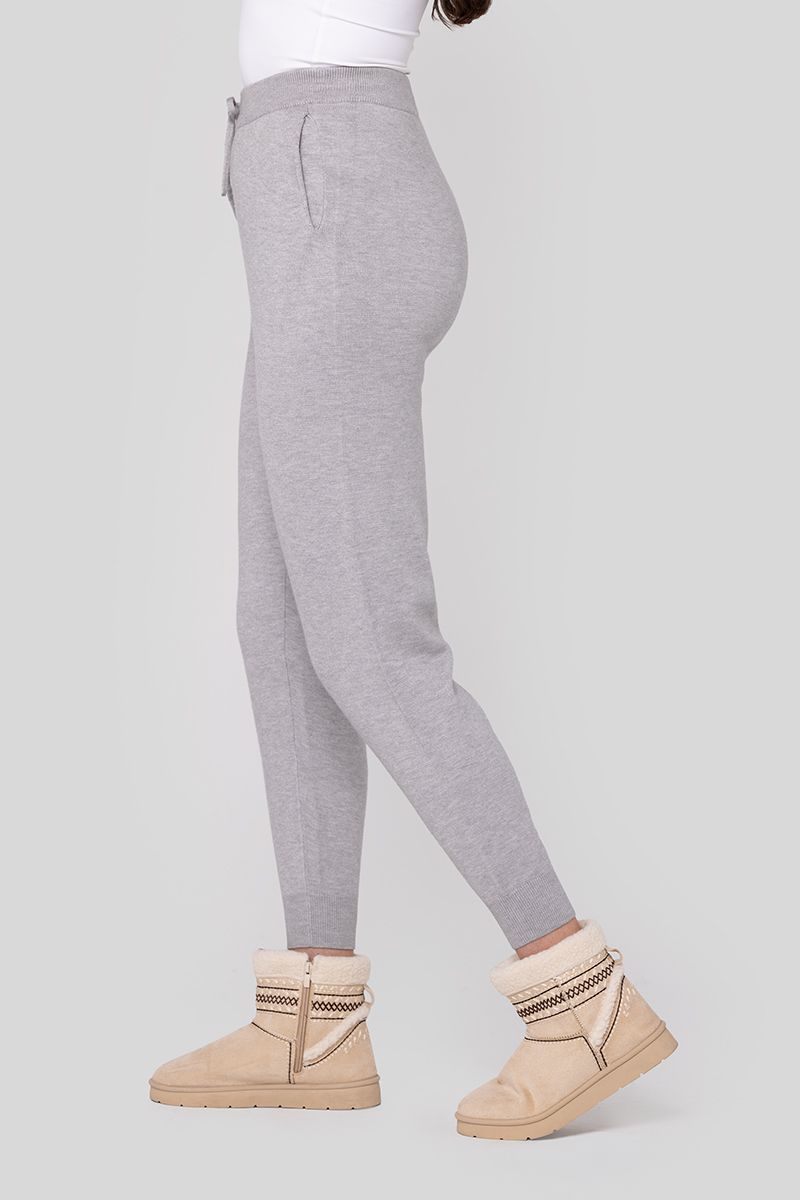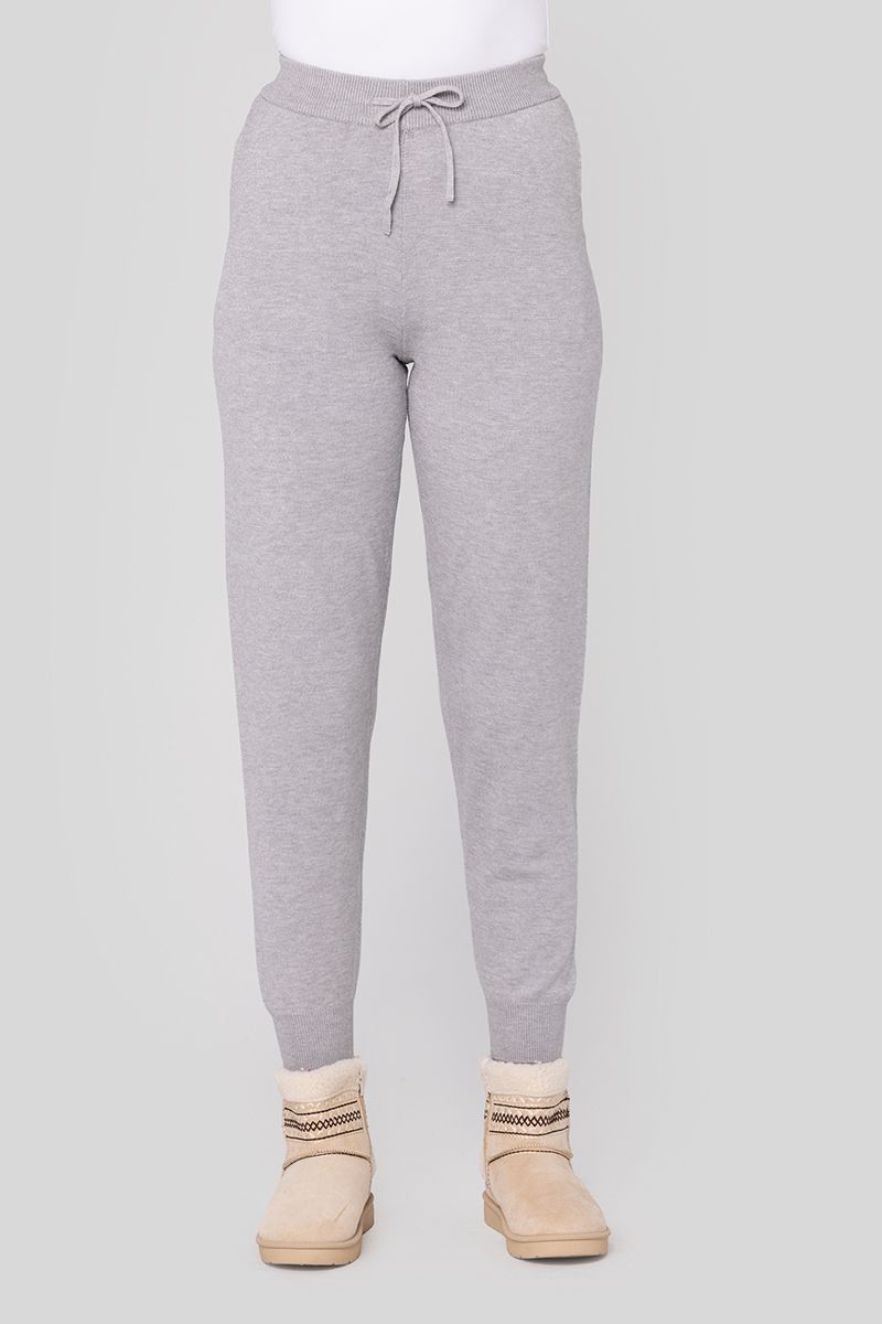 Knitted slim fit pants designed with a ribbed elastic waistband and adjustable drawstring. Features side pockets and a tapered leg for a comfortable and versatile look, ideal for casual wear.