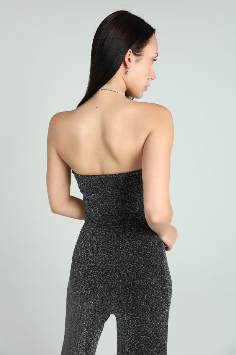 Elegant strapless top with a shimmering finish and fitted cut. Designed for stylish evening looks, perfect to pair with skirts or tailored pants for a refined occasion outfit.