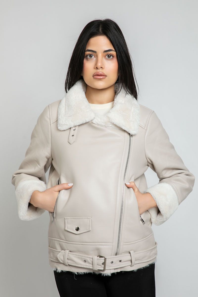 Modern biker jacket crafted from soft faux leather with a plush shearling lining for ultimate comfort and warmth. Designed with an asymmetric front zipper, side pockets, and a belted hem for a structured, stylish winter look.