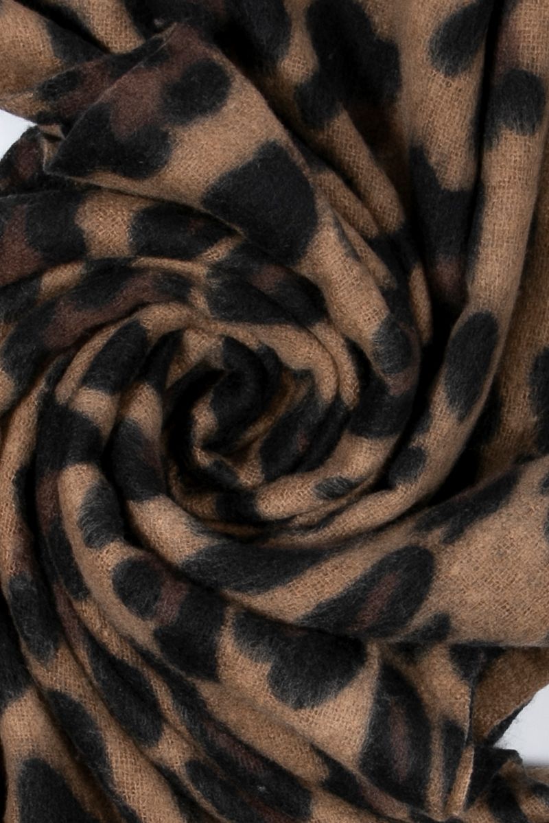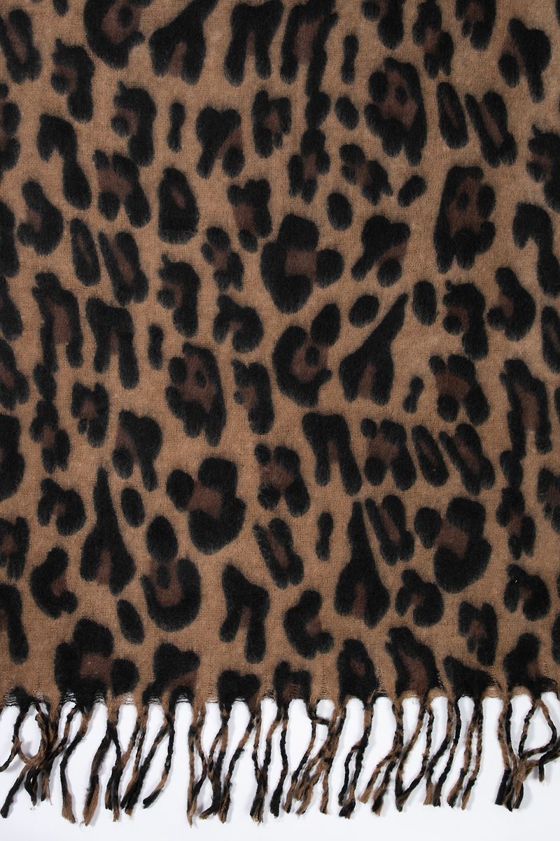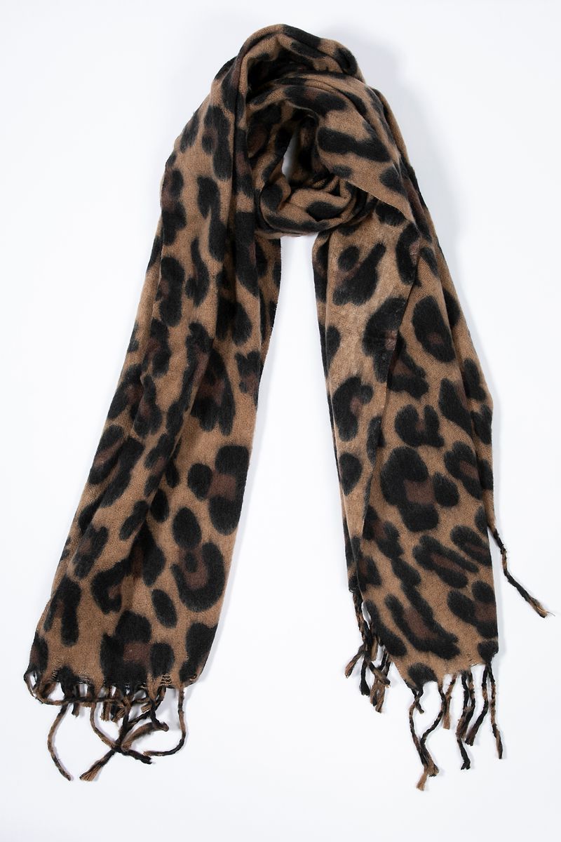 A soft and cozy scarf featuring an animal inspired pattern with tasseled edges. Perfect for adding a stylish touch and extra warmth to your cold weather looks.