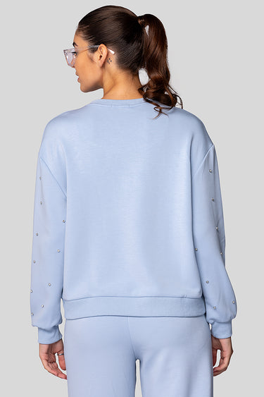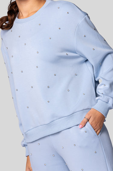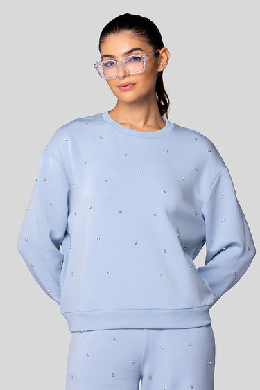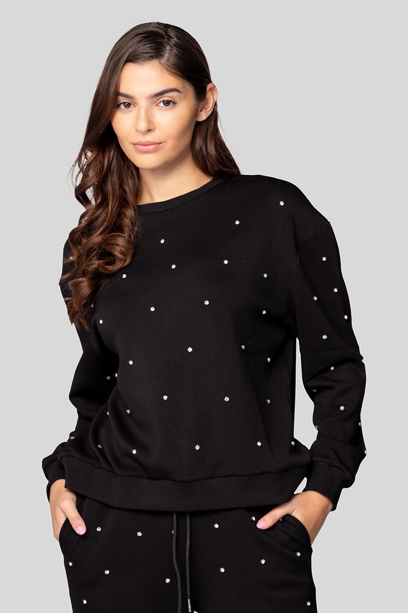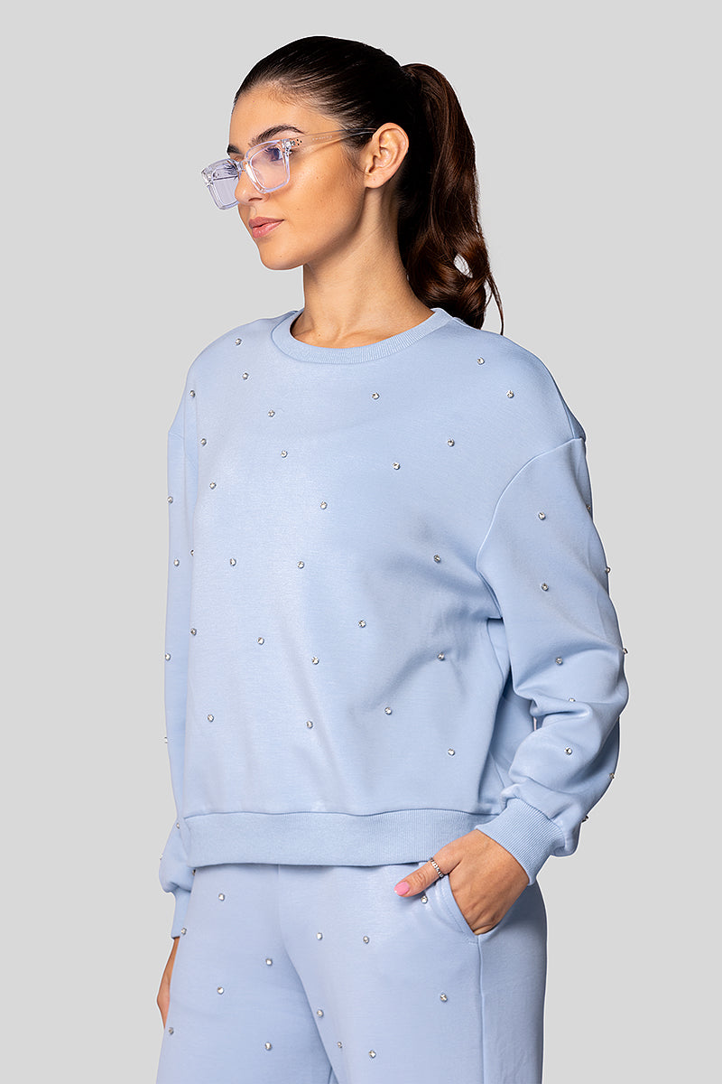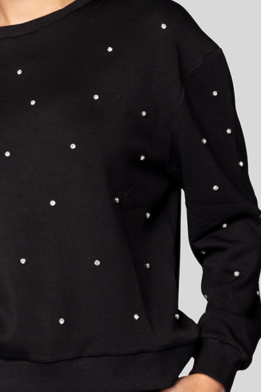 A stylish sweatshirt adorned with small shiny embellishments adding a modern chic touch made from comfortable fabric ideal for everyday wear and easy to pair with jeans or casual pants