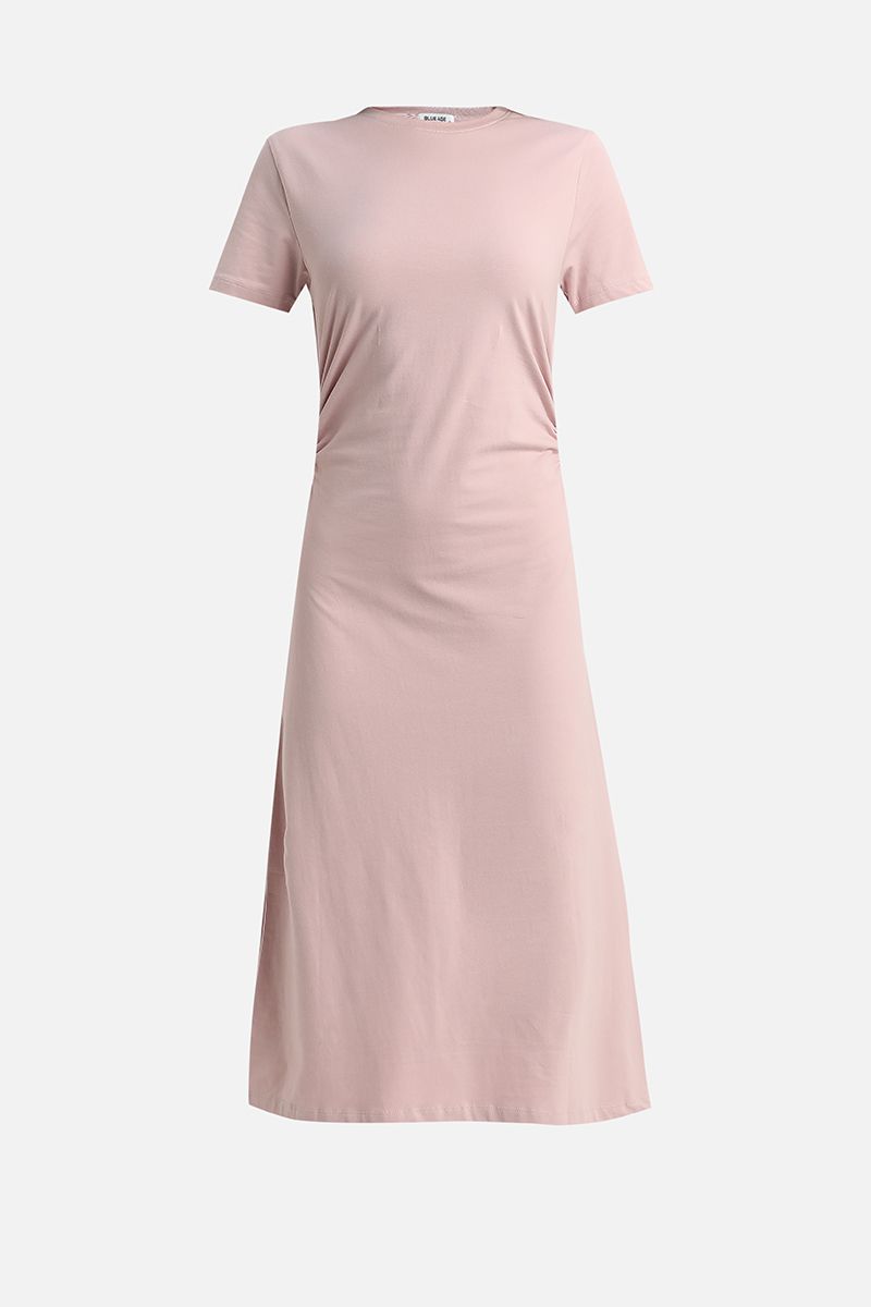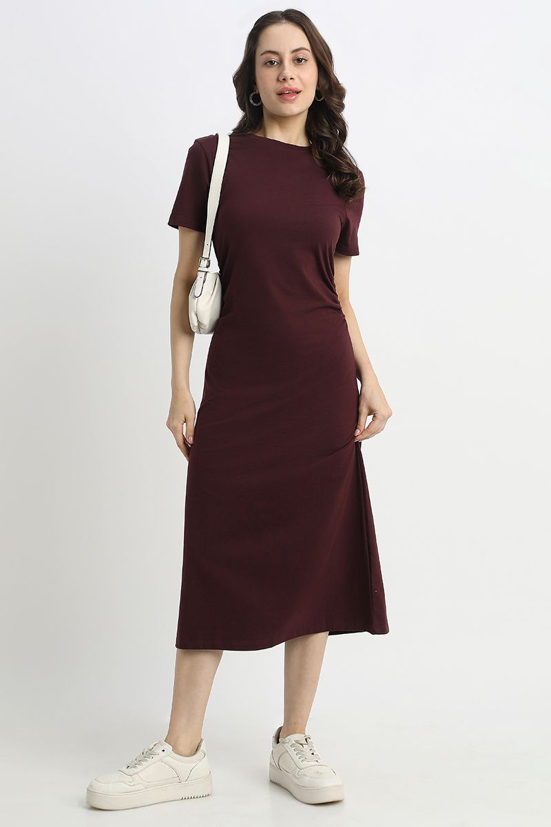 A refined take on a wardrobe essential, this midi dress features a clean solid color and a flattering silhouette. Designed with short sleeves and a classic crew neck, it’s elevated by subtle side trims that define the waist for a feminine shape. Perfect for casual outings, workwear, or effortless everyday elegance.
