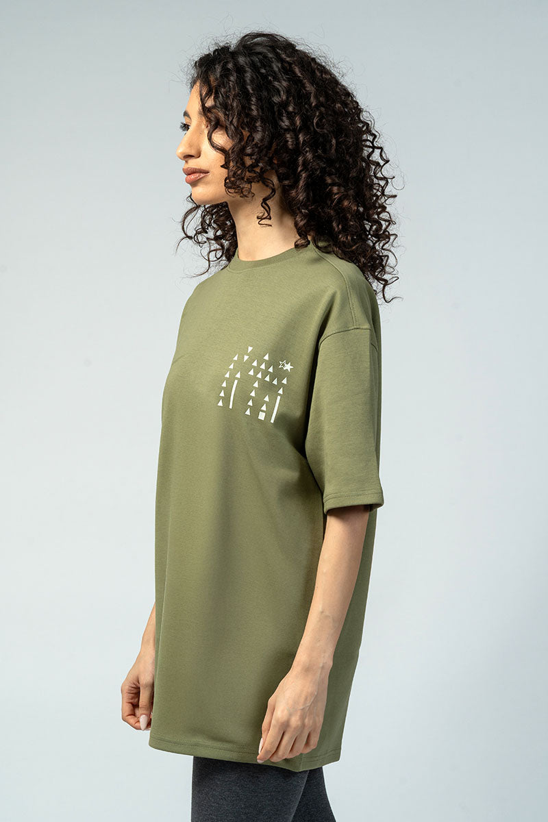 Unisex t-shirt designed with a relaxed oversized fit suitable for both women and men. Features a clean graphic print that adds a modern touch while keeping a minimal look. Ideal for everyday wear and easy to style with different outfits.
