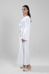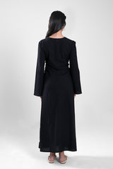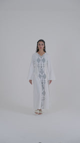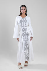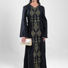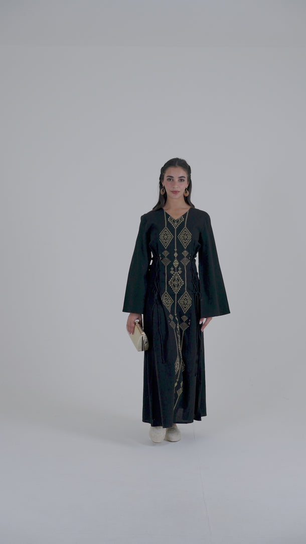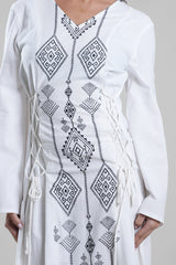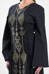Women’s long dress featuring intricate geometric embroidery along the front panel, designed to create a refined vertical silhouette. Finished with long sleeves and adjustable side tie details that allow a flattering, structured fit. A timeless piece suited for formal gatherings, cultural occasions, and elegant evening wear.