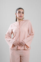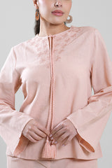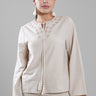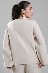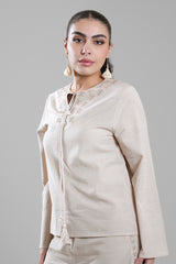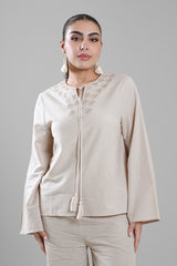 Women’s long-sleeve top featuring subtle embroidered detailing at the neckline and a decorative tie with tassel accents. Designed with a relaxed straight fit and clean lines for easy everyday styling. A versatile piece that works effortlessly with tailored trousers or casual bottoms for a balanced, refined look.