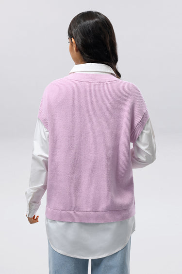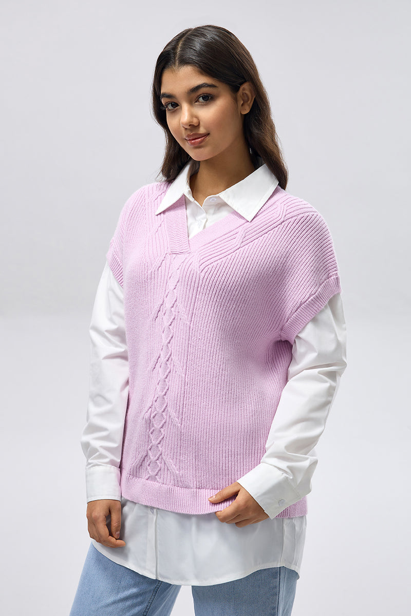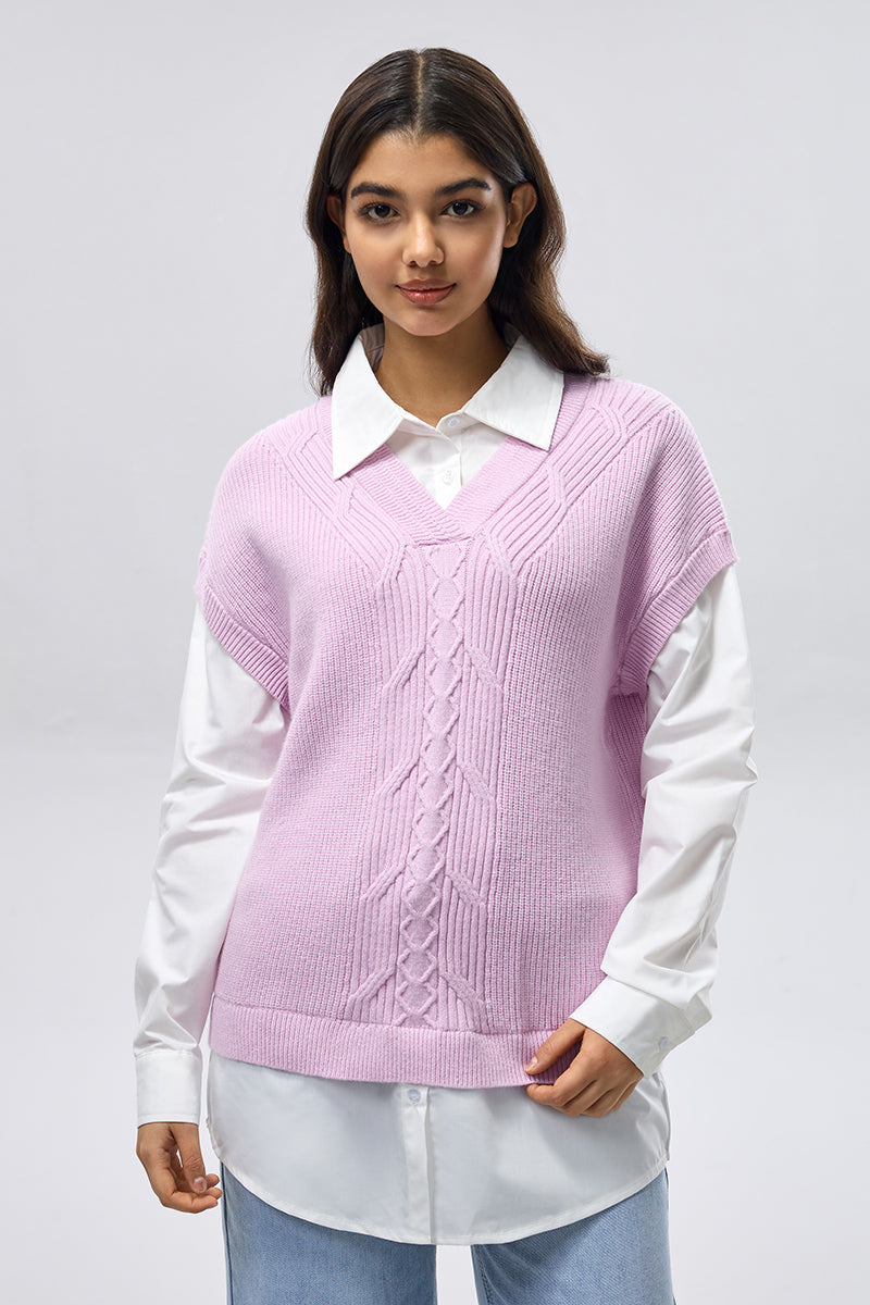 A sleeveless knit vest designed with a classic V-neckline and central cable knit detailing. Crafted from a soft, textured knit, this piece is ideal for layering over shirts or blouses, offering a relaxed yet polished look suitable for everyday wear or smart casual styling.