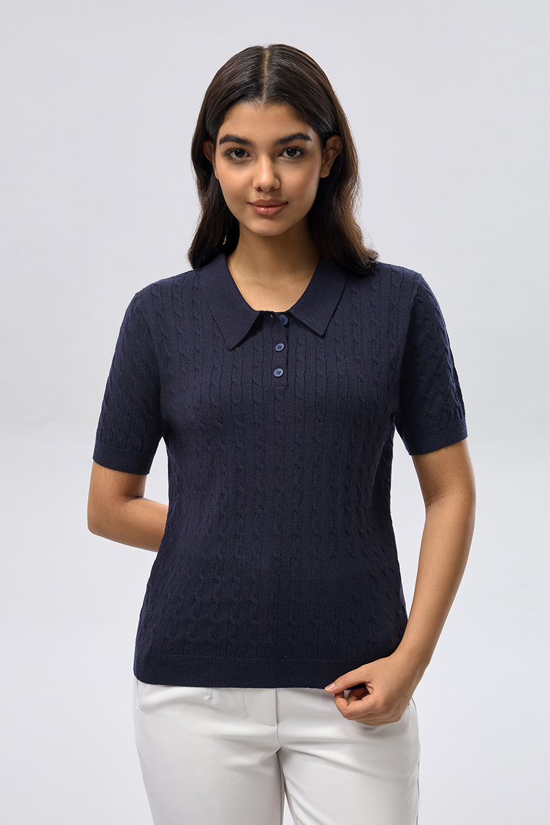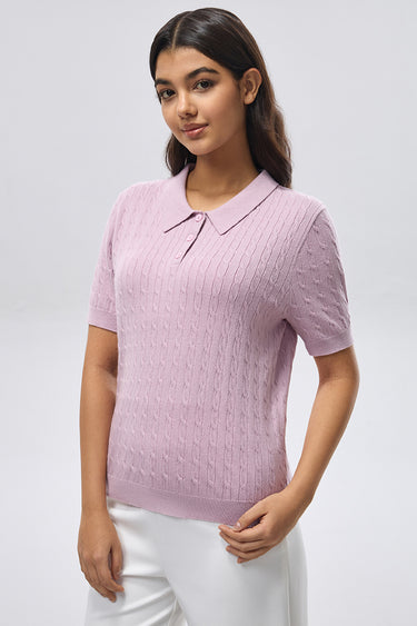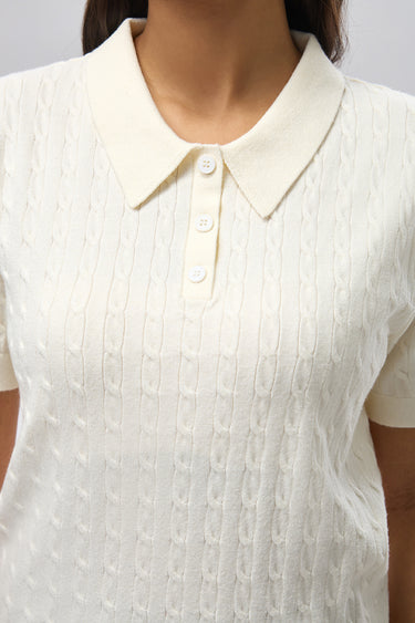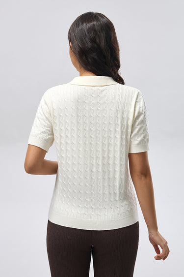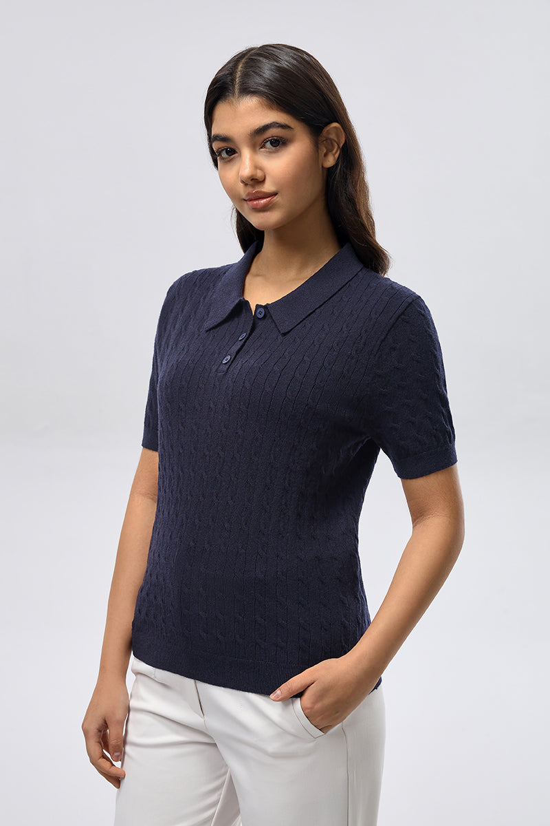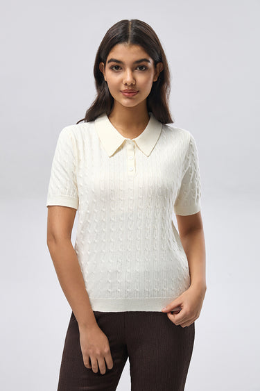 A short sleeve top crafted from soft knitted fabric with a classic polo collar and buttoned placket. Designed with a textured knit pattern and a clean, comfortable fit, making it suitable for everyday wear and easy casual styling.