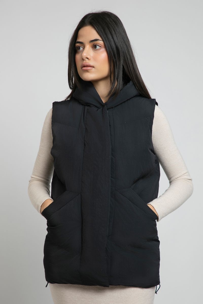 Lightweight padded vest with a relaxed fit and an attached hood. Designed with front pockets and hidden zip closure for a clean, minimal look. Ideal for layering and keeping warm during cooler days.