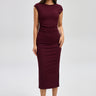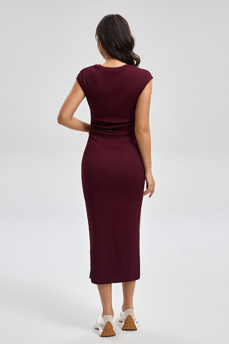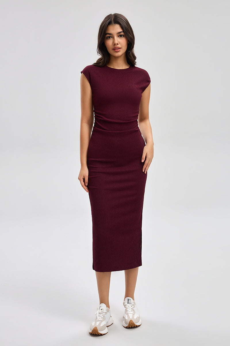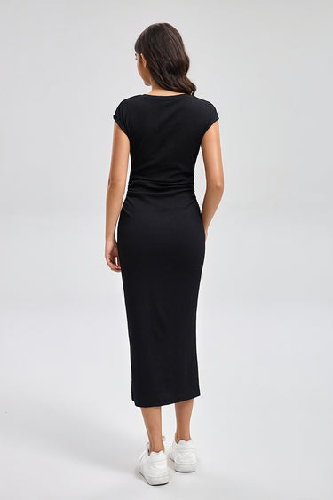 Midi dress designed with a fitted silhouette that follows the body shape. Features short sleeves and a clean round neckline for a balanced everyday look. Finished with a side slit that allows ease of movement and adds a subtle modern touch.