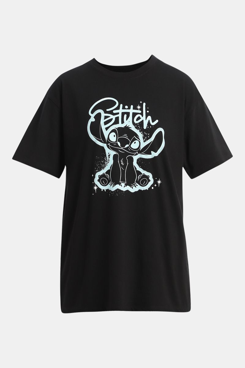 Casual and trendy, this black T-shirt features a bold Stitch print on the front with a stylish graphic design. Made from soft, breathable fabric with a relaxed fit, perfect for everyday wear or lounging in comfort.