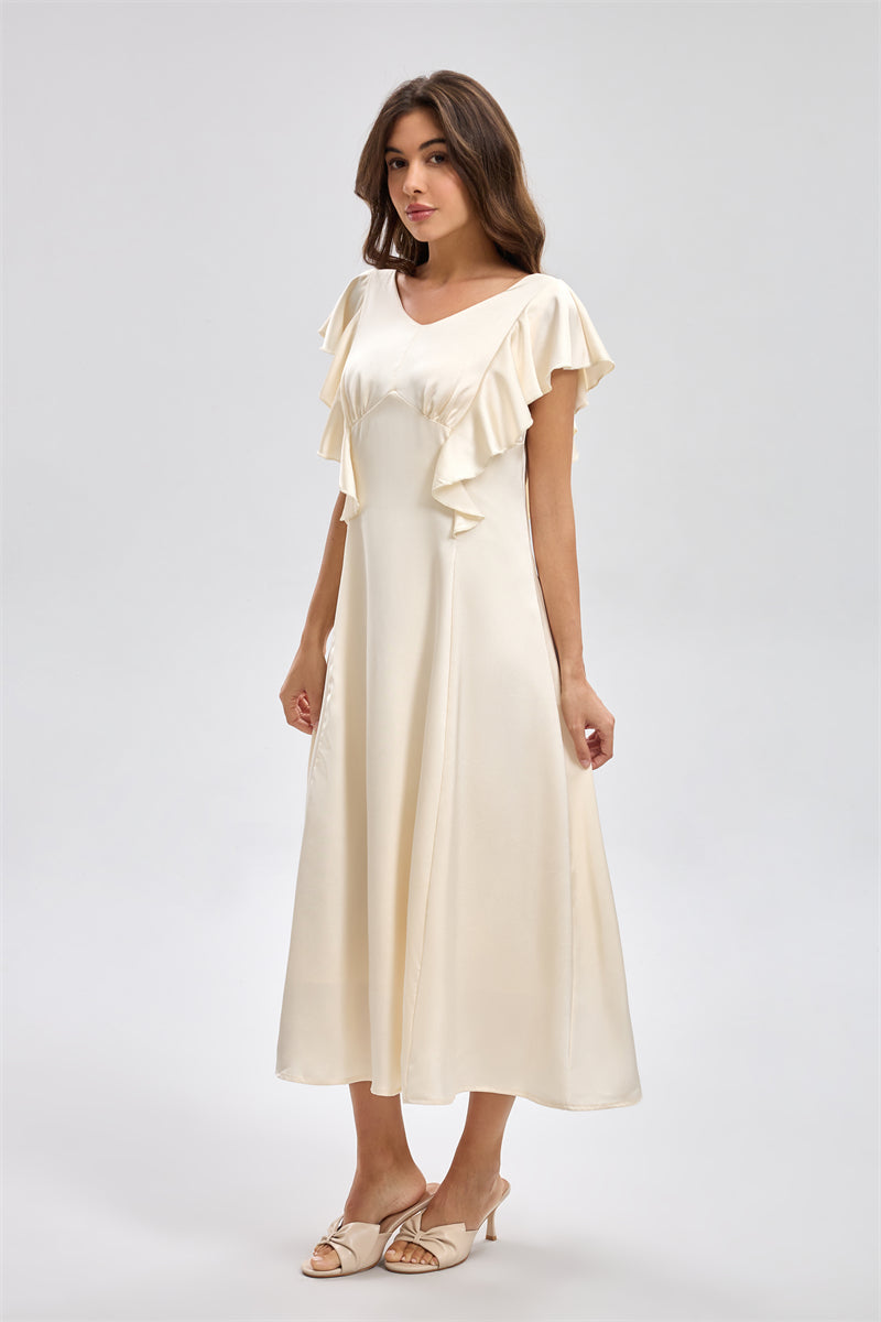 Women's midi dress designed for refined everyday and occasion wear featuring a flowing silhouette with flutter sleeves and a softly shaped waist Lightweight smooth fabric provides comfortable movement and a graceful feminine look Suitable for gatherings events and smart casual occasions Easy to style with simple footwear and accessories for a polished appearance Ideal choice for women seeking elegant modest fashion suitable for Saudi lifestyle