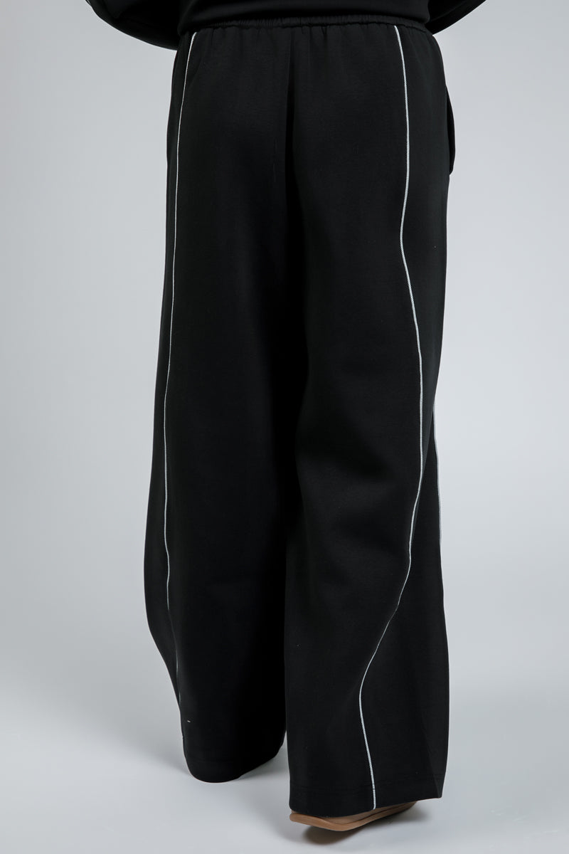 Designed for comfort with a clean, contemporary silhouette. These wide leg pants feature a soft, structured fabric that drapes naturally while allowing easy movement. The elastic waistband with adjustable drawstring provides a flexible, comfortable fit, while side pockets add practical everyday function. Finished with subtle seam detailing for a refined look, this piece is ideal for relaxed daily wear and modern casual styling.