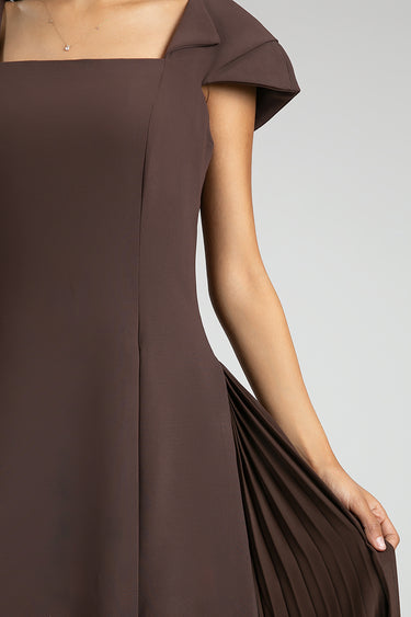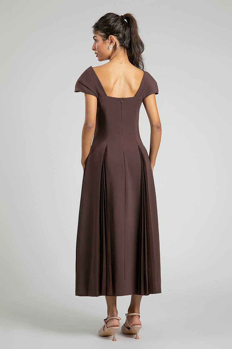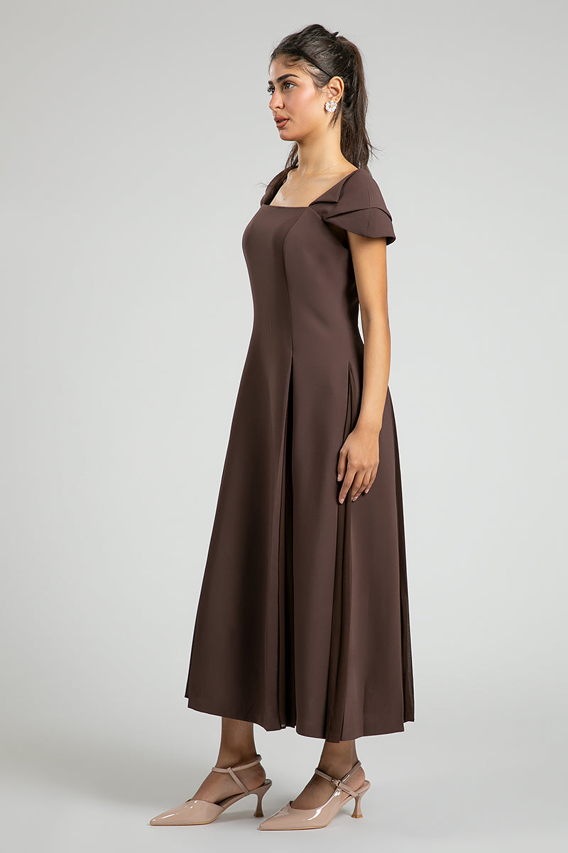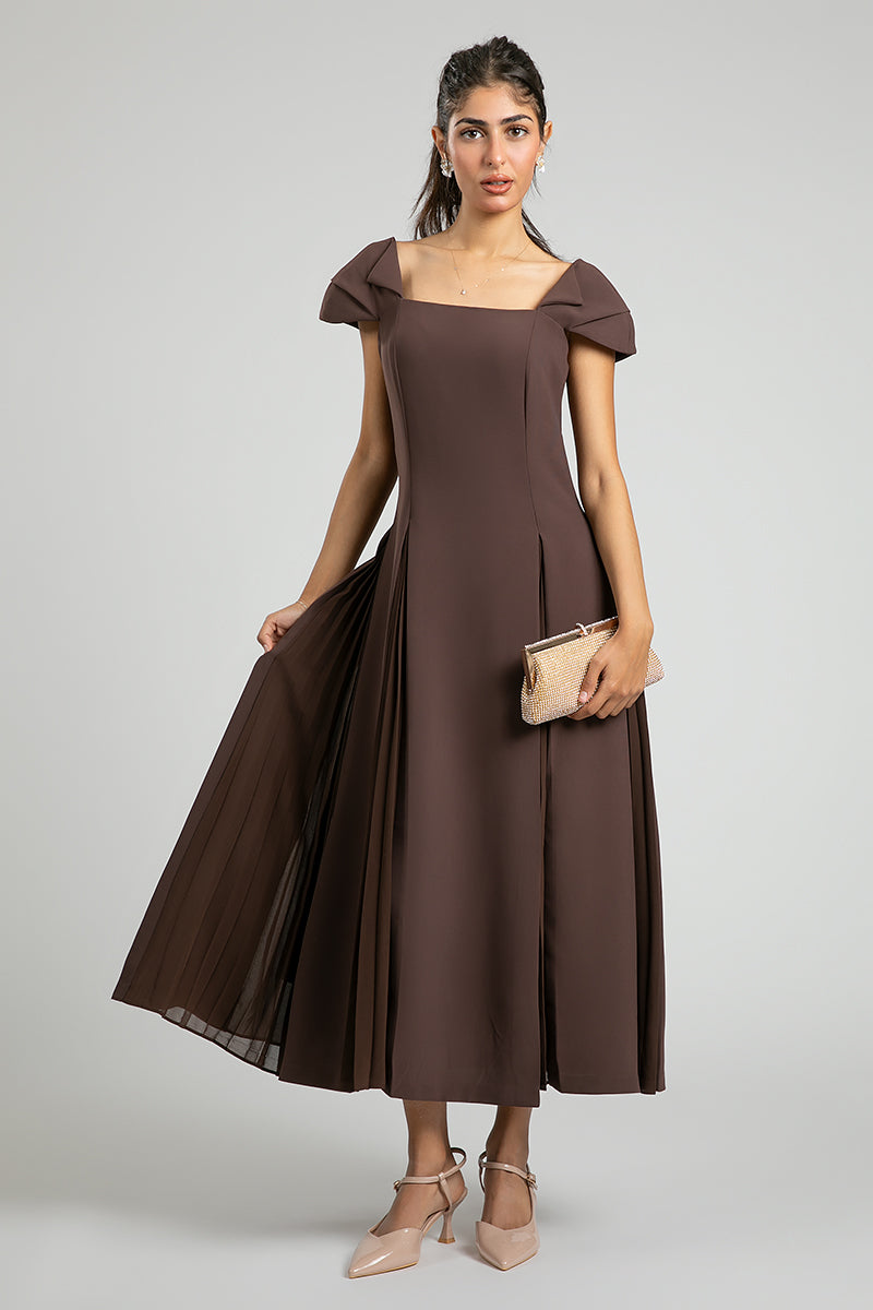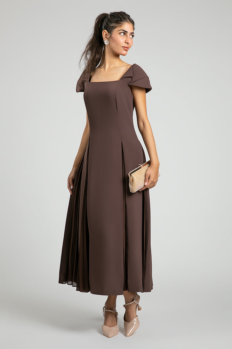 فستان ميدي أنيق يتميز بقصة محددة من الأعلى مع طيات جانبية ناعمة تضيف حركة وانسيابية للتصميم. يمنح القَصّ الممشوق إطلالة أنثوية راقية، بينما تضفي الطيات لمسة فخمة تناسب المناسبات واللقاءات الخاصة. يمكن تنسيقه بسهولة مع الكعب أو الإكسسوارات لإطلالة متكاملة.